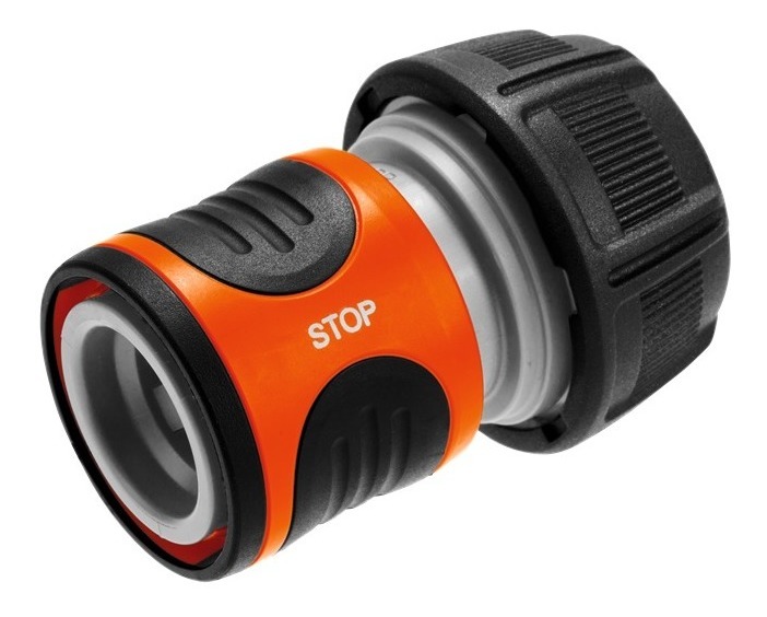 El conector Stop GARDENA se conecta a la salida de la manguera. Cuando se desconecta un dispositivo de conexión, por ejemplo, una boquilla o rociador, se detiene el agua de forma automática; cuando se conecta un dispositivo, el agua fluye libremente de nuevo.