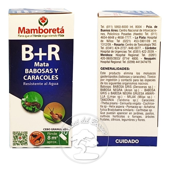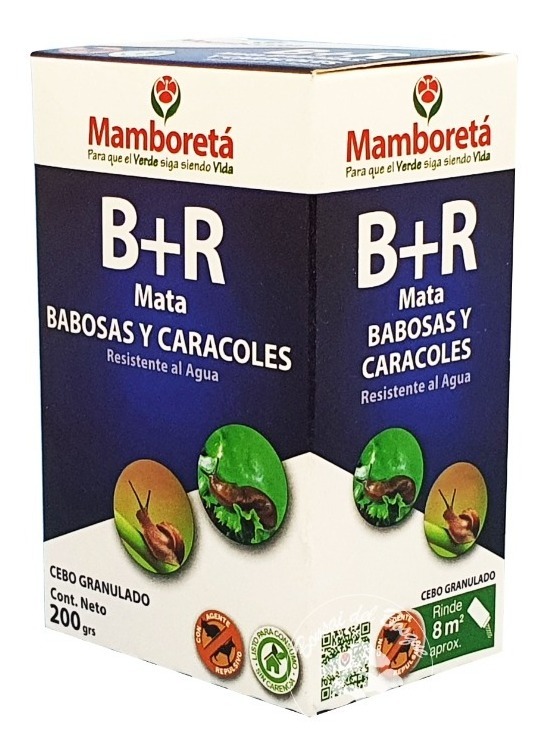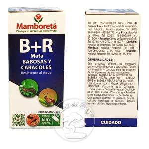Mamboretá B+R es un insecticida granulado que elimina los moluscos por ingestión y contacto. Su agente repulsivo ahuyenta perros y gatos (pero no otros animales domésticos). Se aplica de a 25gr por mt2, y durante la noche, las babosas y caracoles serán atraídos al cebo, que después de ingerirlo serán eliminados.